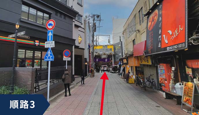 ![]() 角のセブンイレブンを左手に見ながら、正面奥の川端商店街入り口まで約50m直進します。 |