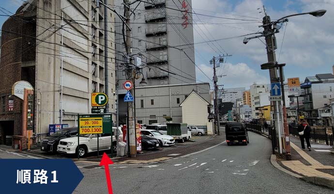 ![]() 横断歩道先にある背の高いビル(1階の角にセブンイレブン博多上川端店)が目印です。 |